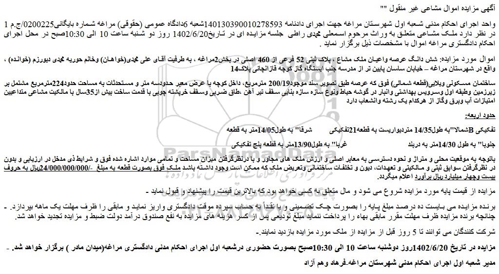 اموال مورد مزایده: شش دانگ عرصه واعیان ملک مشاع ، پلاک ثبتی 52 فرعی از 460 اصلی در بخش2مراغه ، به طرفیت آقای علی محمدی(خواهان) وخانم حوریه محمدی دیورزم (خوانده) ، واقع در شهرستان مراغه – خیابان ساسان پایین تر از مدرسه جنب ایستگاه گاز کوچه قازانچائی پلاک14