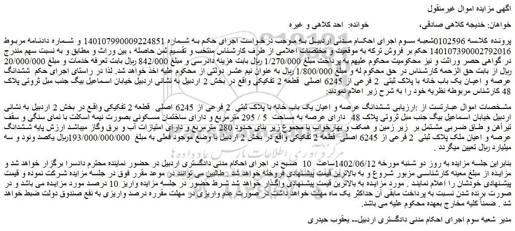 پرونده کلاسه 0102596شعبه سوم اجرای احکام مدنی اردبیل به موجب درخواست اجرای حکم به شماره 140107990009224851 و شماره دادنامه مربوط 140107390002792016 حکم بر فروش ترکه به موقعیت و مختصات اعلامی از طرف کارشناس منتخب و تقسیم ثمن حاصله ، بین وراث و مطابق و به نسبت سهم مندرج در گواهی حصر وراثت و نیز محکومیت محکوم علیهم به پرداخت مبلغ 1/270/000 ریال بابت هزینه دادرسی و مبلغ 842/000 ریال بابت تعرفه خدمات و مبلغ 20/000/000 ریال از بابت حق الزحمه کارشناس در حق محکوم له و مبلغ 1/800/000 ریال به عنوان نیم عشر دولتی از محکوم علیه اخذ خواهد شد. لذا در راستای اجرای حکم  ششدانگ عرصه و اعیان یک باب خانه با پلاک ثبتی  2 فرعی از 6245 اصلی  قطعه 2 تفکیکی واقع در بخش 2 اردبیل به نشانی اردبیل خیابان اسماعیل بیگ جنب مبل ثروتی پلاک 48 کارشناس مربوطه نظریه خود را به شرح زیر اعلام نمودند: