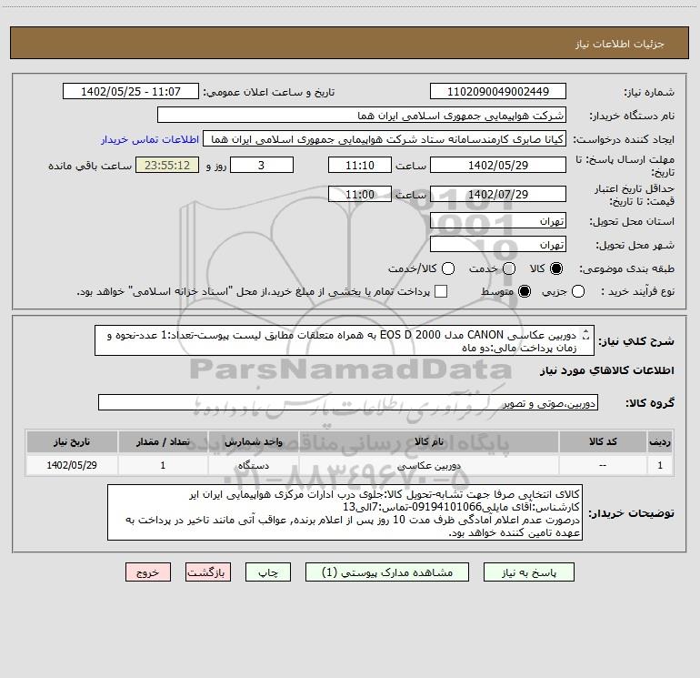 شرح کلی نیاز: دوربین عکاسی CANON مدل 2000 EOS D به همراه متعلقات مطابق لیست پیوست-تعداد:1 عدد-نحوه و زمان پرداخت مالی:دو ماه