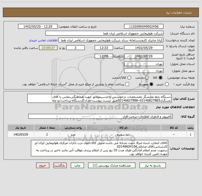 شرح کلی نیاز: دستگاه رابط نمایشگر بامشخصات درخواستی واحدسیمولاتور جهت هماهنگی,تماس با آقای عسگری02146627883–02146627896طبق لیست پیوست-تعداد:2دستگاه-پرداخت:دو ماه