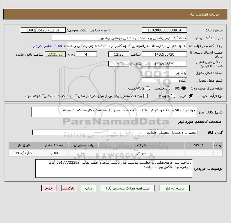 شرح کلی نیاز: حودکار آب 50 بسته،خودکار قرمز،10 بسته،خودکار سبز 10 بسته،خودکار مشکی 5 بسته ...