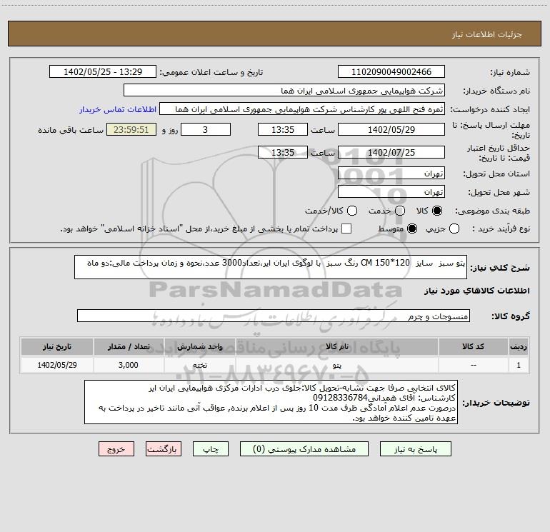 شرح کلی نیاز: پتو سبز سایز 120*150 CM رنگ سبز با لوگوی ایران ایر،تعداد3000 عدد،نحوه و زمان پرداخت مالی:دو ماه
