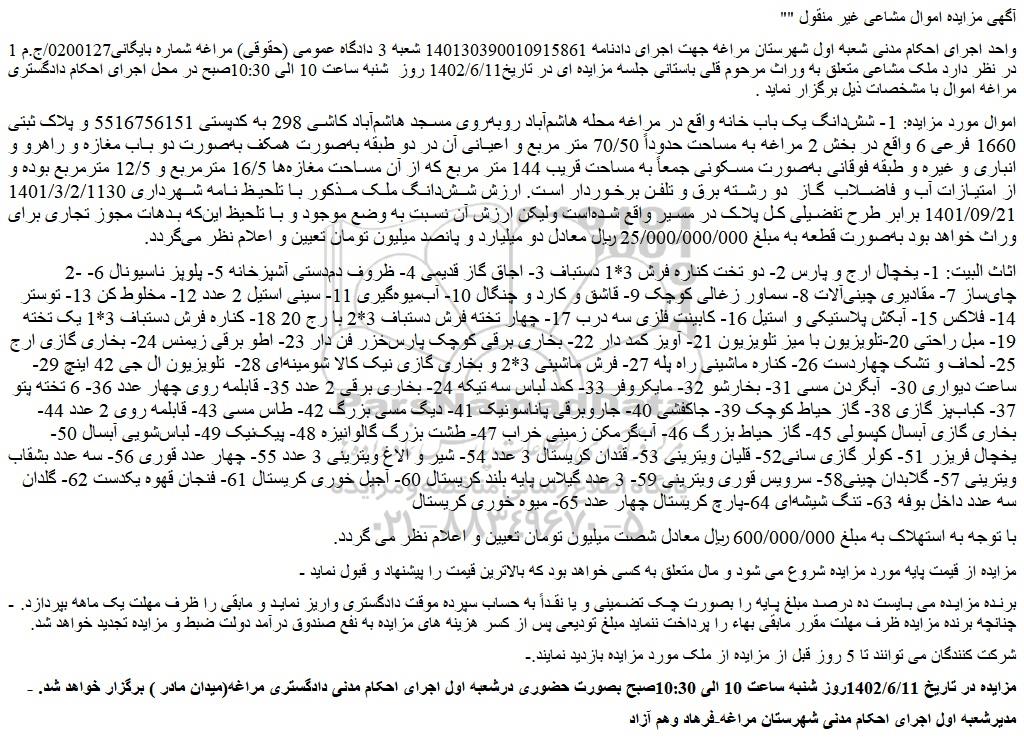 اموال مورد مزایده: 1- شش دانگ یک باب خانه واقع در مراغه محله هاشم آباد روبه روی مسجد هاشم آباد کاشی 298 به کدپستی 5516756151 و پلاک ثبتی 1660 فرعی 6 واقع در بخش 2 مراغه به مساحت حدوداً 70/50 متر مربع و اعیانی آن در دو طبقه به صورت همکف به صورت دو باب مغازه و راهرو و انباری و غیره و طبقه فوقانی به صورت مسکونی جمعاً به مساحت قریب 144 متر مربع که از آن مساحت مغازه ها 16/5 مترمربع و 12/5 مترمربع بوده و از امتیازات آب و فاضلاب  گاز  دو رشته برق و تلفن برخوردار است. ارزش شش دانگ ملک مذکور با تلحیظ نامه شهرداری 1401/3/2/1130 1401/09/21 برابر طرح تفضیلی کل پلاک در مسیر واقع شده است ولیکن ارزش آن نسبت به وضع موجود و با تلحیظ این که بدهات مجوز تجاری برای وراث خواهد بود به صورت قطعه به مبلغ 25/000/000/000 ریال معادل دو میلیارد و پانصد میلیون تومان تعیین و اعلام نظر می گردد.