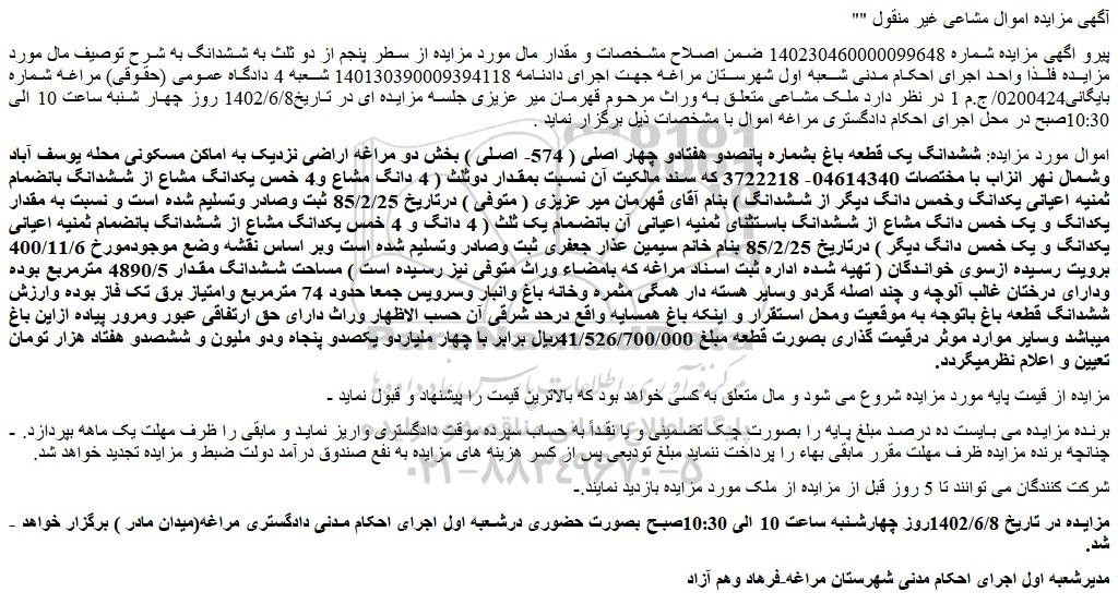 پیرو اگهی مزایده شماره 140230460000099648 ضمن اصلاح مشخصات و مقدار مال مورد مزایده از سطر پنجم از دو ثلث به ششدانگ به شرح توصیف مال مورد مزایده فلذا واحد اجرای احکام مدنی شعبه اول شهرستان مراغه جهت اجرای دادنامه 140130390009394118 شعبه 4 دادگاه عمومی (حقوقی) مراغه شماره بایگانی0200424/ج.م 1 در نظر دارد ملک مشاعی متعلق به وراث مرحوم قهرمان میر عزیزی جلسه مزایده ای در تاریخ1402/6/8 روز چهار شنبه ساعت 10 الی 10:30صبح در محل اجرای احکام دادگستری مراغه اموال با مشخصات ذیل برگزار نماید .