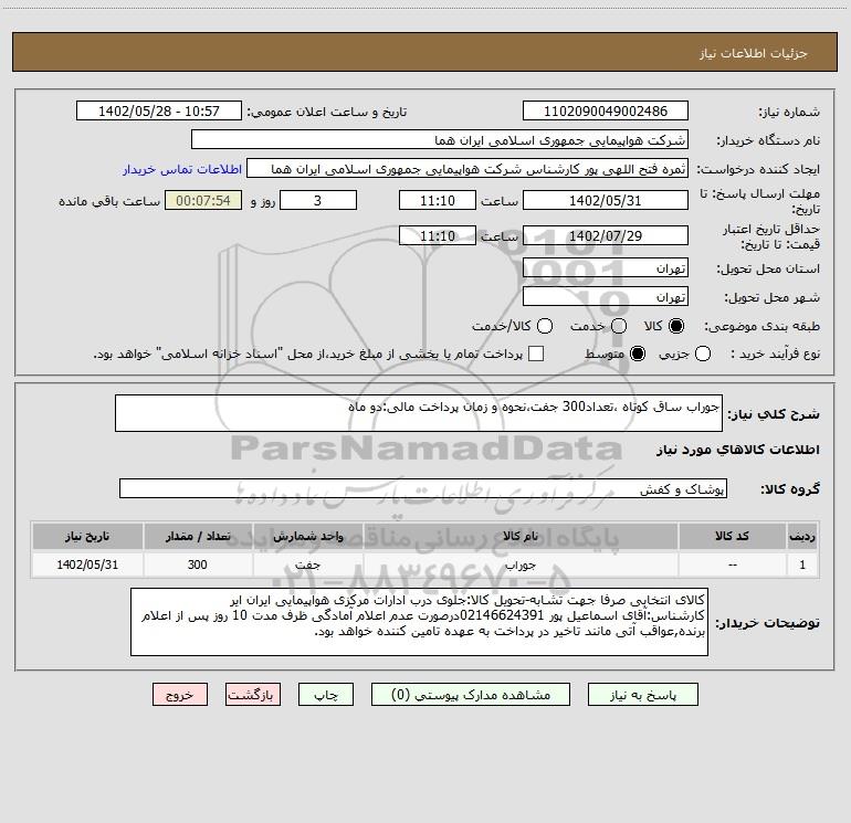 شرح کلی نیاز: جوراب ساق کوتاه ،تعداد300 جفت،نحوه و زمان پرداخت مالی:دو ماه