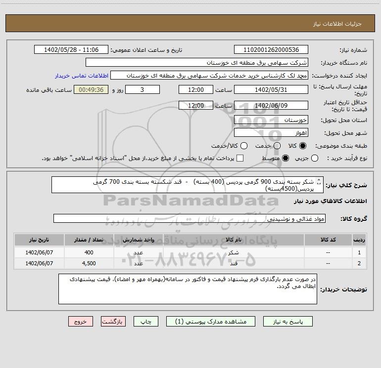شرح کلی نیاز: شکر بسته بندی 900 گرمی پردیس (400 بسته) - قند شکسته بسته بندی 700 گرمی پردیس(4500بسته)