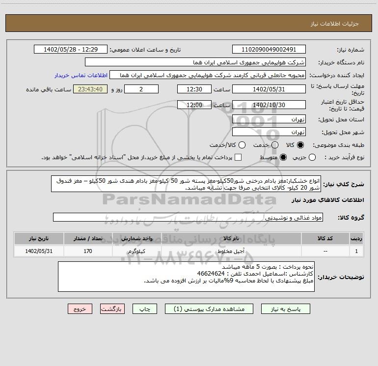 شرح کلی نیاز: انواع خشکبار:مغز بادام درختی شور50کیلو-مغز پسته شور 50 کیلو-مغز بادام هندی شور 50کیلو – مغز فندوق شور 20 کیلو- کالای انتخابی صرفا جهت تشابه میباشد.