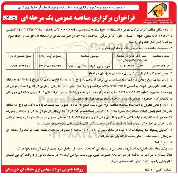 مناقصه خرید باتری 2 ولت 200 آمپر ساعت, مناقصه خرید باتری 2 ولت 200 آمپر ساعت