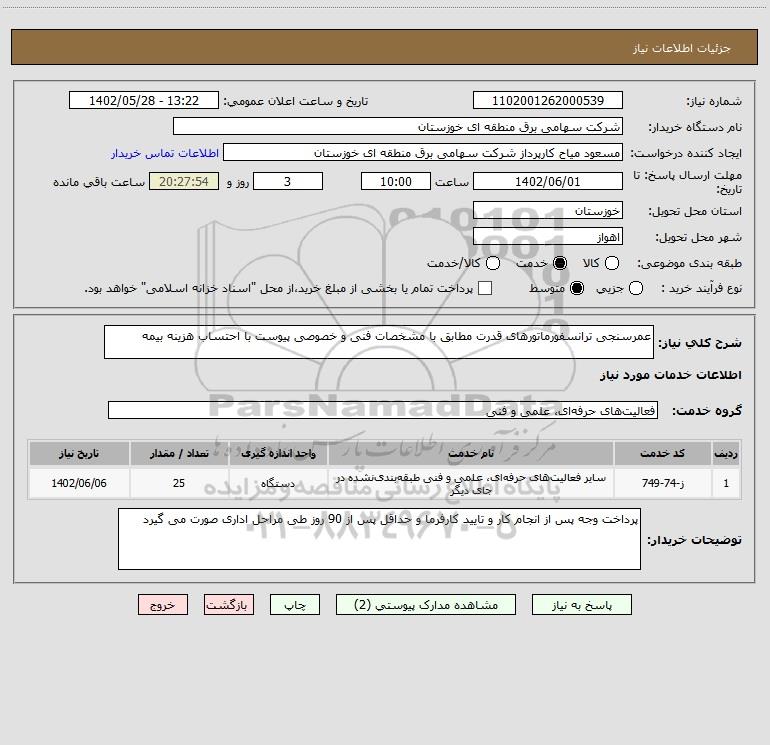شرح کلی نیاز: عمرسنجی ترانسفورماتورهای قدرت مطابق با مشخصات فنی و خصوصی پیوست با احتساب هزینه بیمه