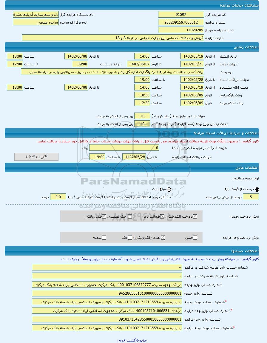 مزایده ، فروش واحدهای خدماتی برج تجارت جهانی در طبقه 8 و 18 -مزایده ساختمان - استان آذربایجان شرقی ؟