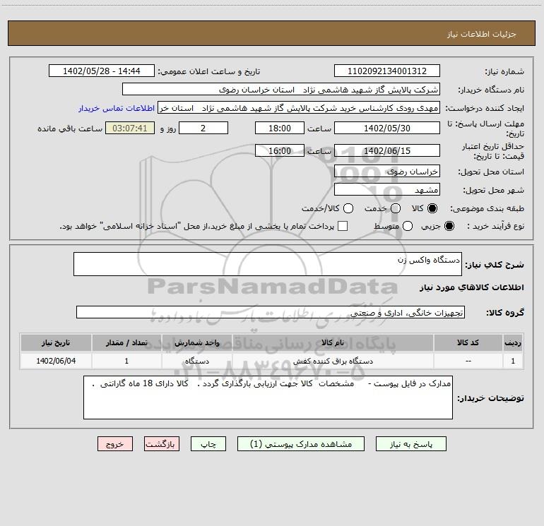 نام دستگاه خریدار:شرکت پالایش گاز شهید هاشمی نژاد استان خراسان رضوی