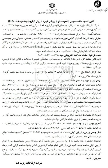 توضیح: باعنایت به اینکه مناقصه مذکور نیاز به بررسی کیفی مناقصه گران دارد.لذا بررسی پیشنهاد قیمت پس از انجام ارزیابی کیفی مناقصه توسط کمیته فنی و بازرگانی انجام خواهد گرفت. براین اساس پیشنهاد مناقصه گرانی که در مرحله ارزیابی کیفی امتیاز لازم راکسب ننمایند، مورد بررسی قرار نمی گیرد و پاکت مربوط به تضمین شرکت در فرایند ارجاع کار عودت می شود وشرکت ارتباطات زیر ساخت در خصوص بهای فروش اسناد و هزینه اخذ ضمانت نامه هیچگونه مسئولیتی‌ را ندارد.