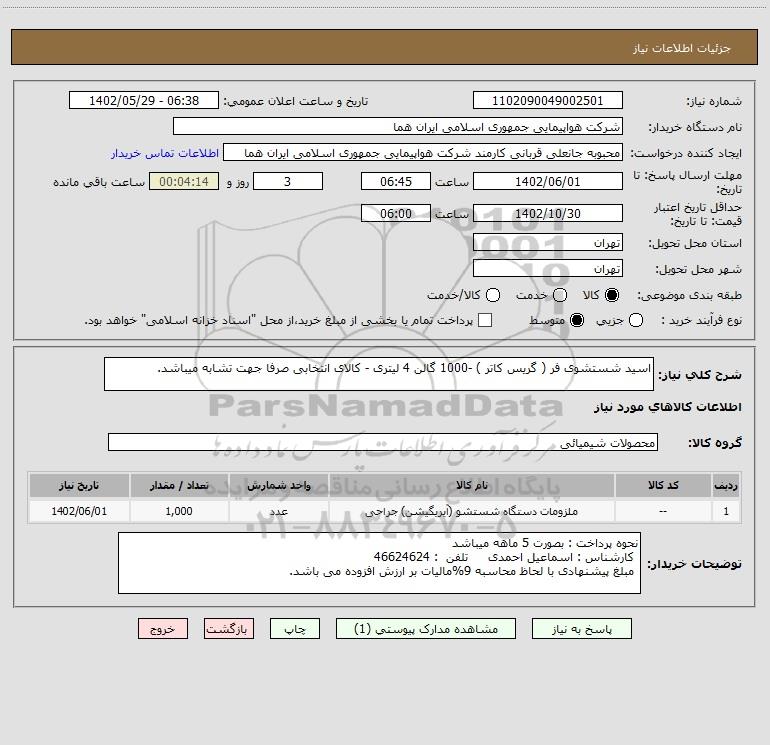 شرح کلی نیاز: اسید شستشوی فر ( گریس کاتر ) -1000 گالن 4 لیتری - کالای انتخابی صرفا جهت تشابه میباشد.