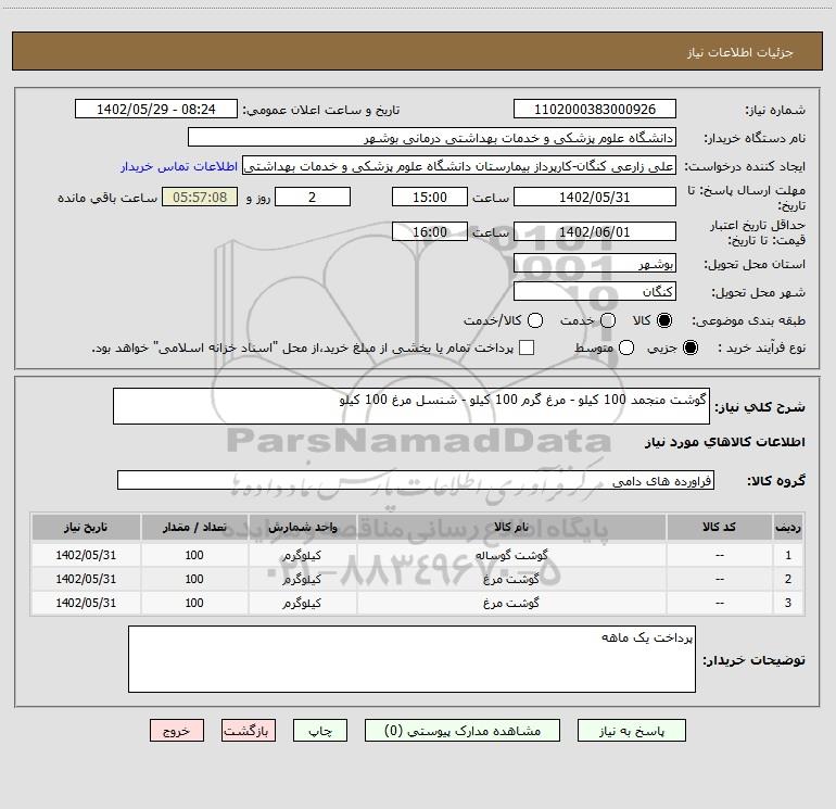 شرح کلی نیاز: گوشت منجمد 100 کیلو - مرغ گرم 100 کیلو - شنسل مرغ 100 کیلو
