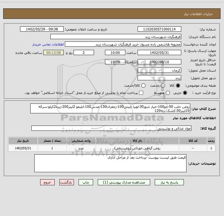 | 1 | -- | روغن گیاهی خوراکی (روغن نباتی) | عدد | 1 | 1402/05/31 |
