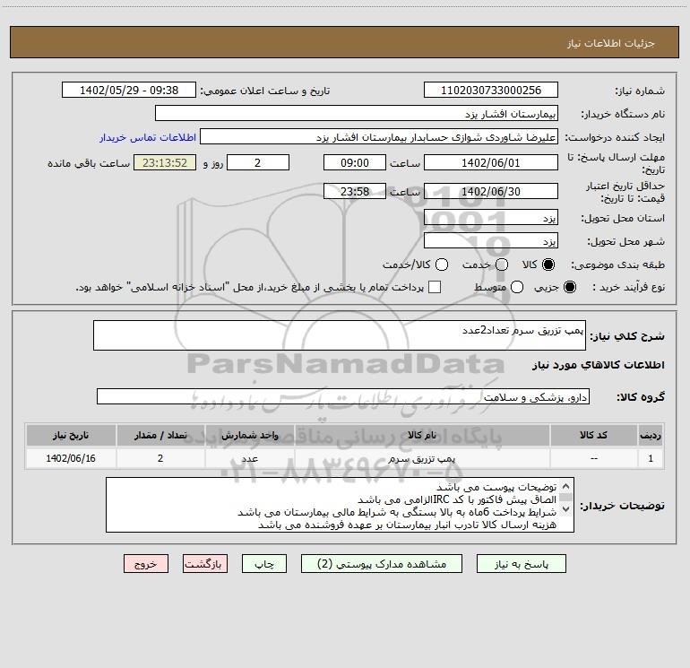 | 1 | -- | پمپ تزریق سرم | عدد | 2 | 1402/06/16 |