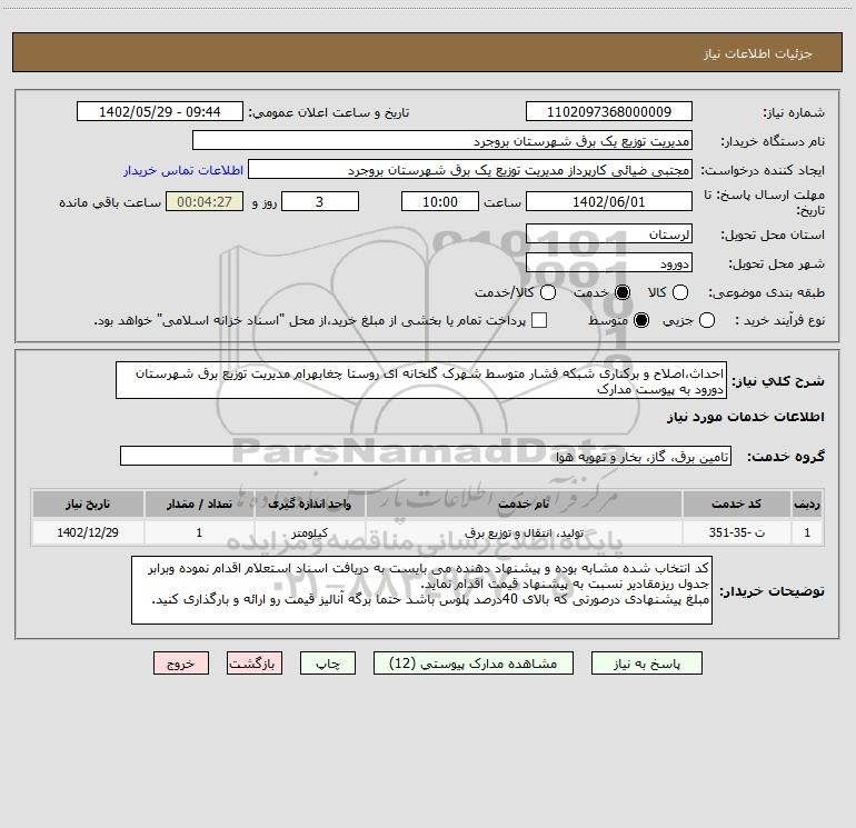 شرح کلی نیاز: احداث،اصلاح و برکناری شبکه فشار متوسط شهرک گلخانه ای روستا چغابهرام مدیریت توزیع برق شهرستان دورود به پیوست مدارک