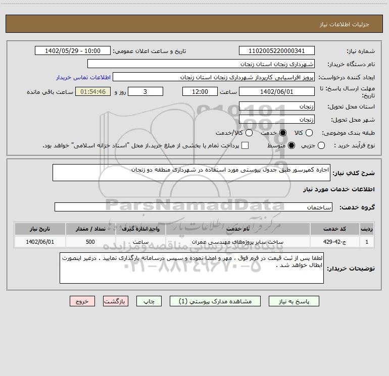شرح کلی نیاز: اجاره کمپرسور طبق جدول پیوستی مورد استفاده در شهرداری منطقه دو زنجان