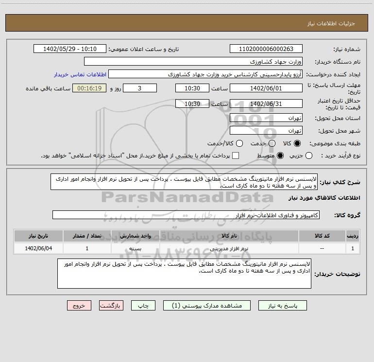 شرح کلی نیاز: لایسنس نرم افزار مانیتورینگ مشخصات مطابق فایل پیوست . پرداخت پس از تحویل نرم افزار وانجام امور اداری و پس از سه هفته تا دو ماه کاری است.