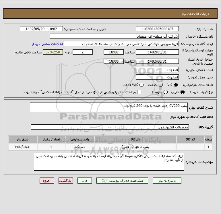 شرح کلی نیاز: پمپ CV200 چهار طبقه با توان 560 کیلو وات
