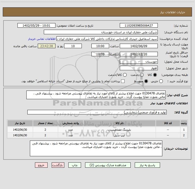 توضیحات خریدار:تقاضای 0130478 جهت اطلاع بیشتر از کالای مورد نیاز به تقاضای پیوستی مراجعه شود ، پیشنهاد فنی ، مالی بصورت مجزا پیوست گردد ، خرید بصورت اعتباری میباشد.