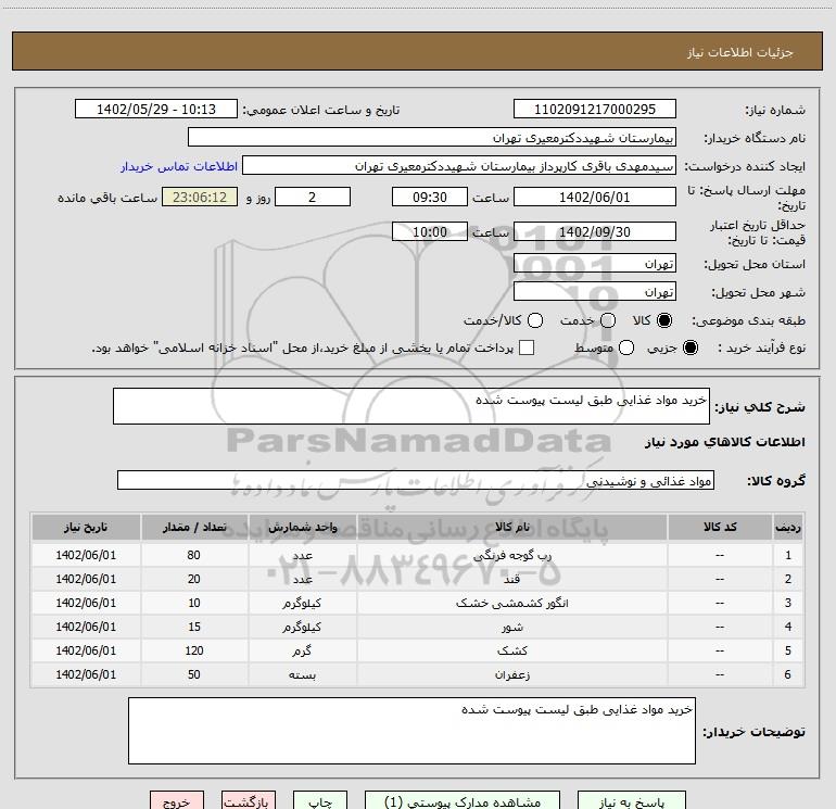 شرح کلی نیاز: خرید مواد غذایی طبق لیست پیوست شده