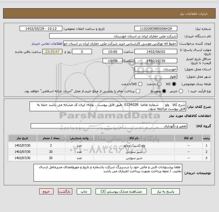 شرح کلی نیاز: شرح کالا ولو شماره تقاضا 0134028 طبق فایل پیوست . توجه: ایران کد مشابه می باشد حتما به فایل پیوست مراجعه شود.