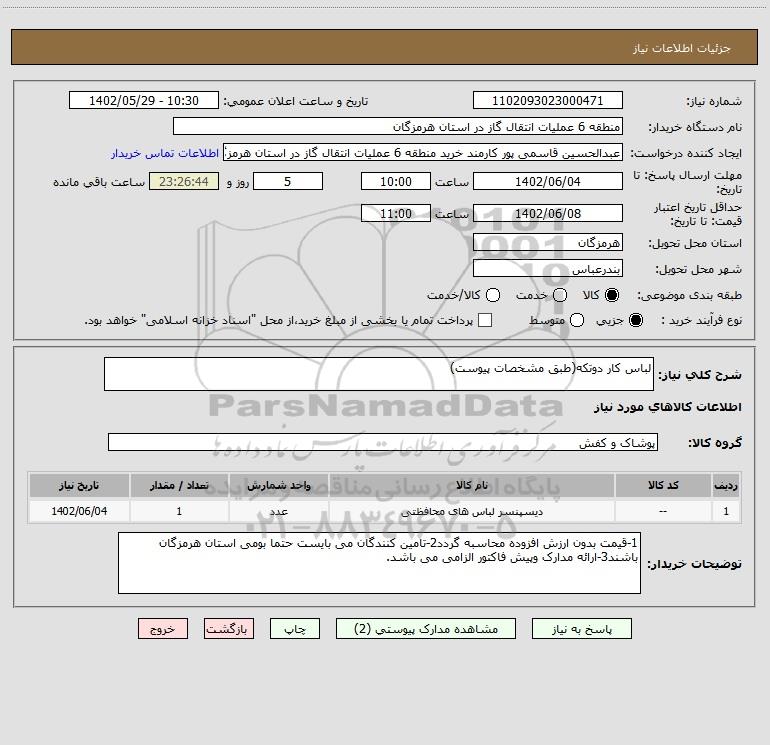 نام دستگاه خریدار:منطقه 6 عملیات انتقال گاز در استان هرمزگان