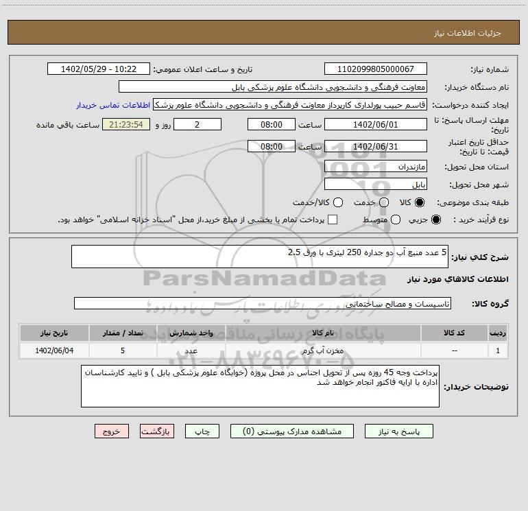 شرح کلی نیاز: 5 عدد منبع آب دو جداره 250 لیتری با ورق 2.5