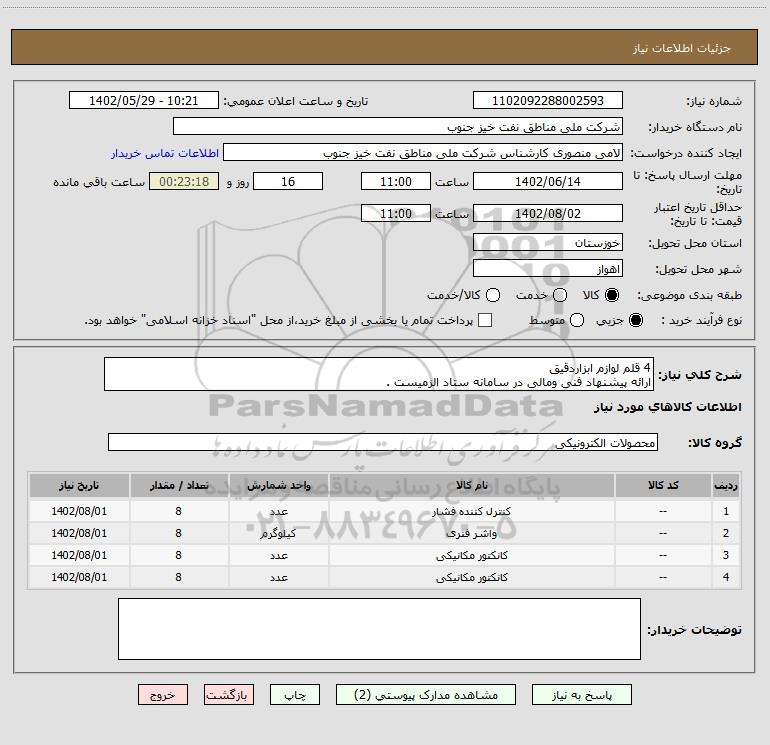 شرح کلی نیاز: 4 قلم لوازم ابزاردقیق ارائه پیشنهاد فنی ومالی در سامانه ستاد الزمیست .