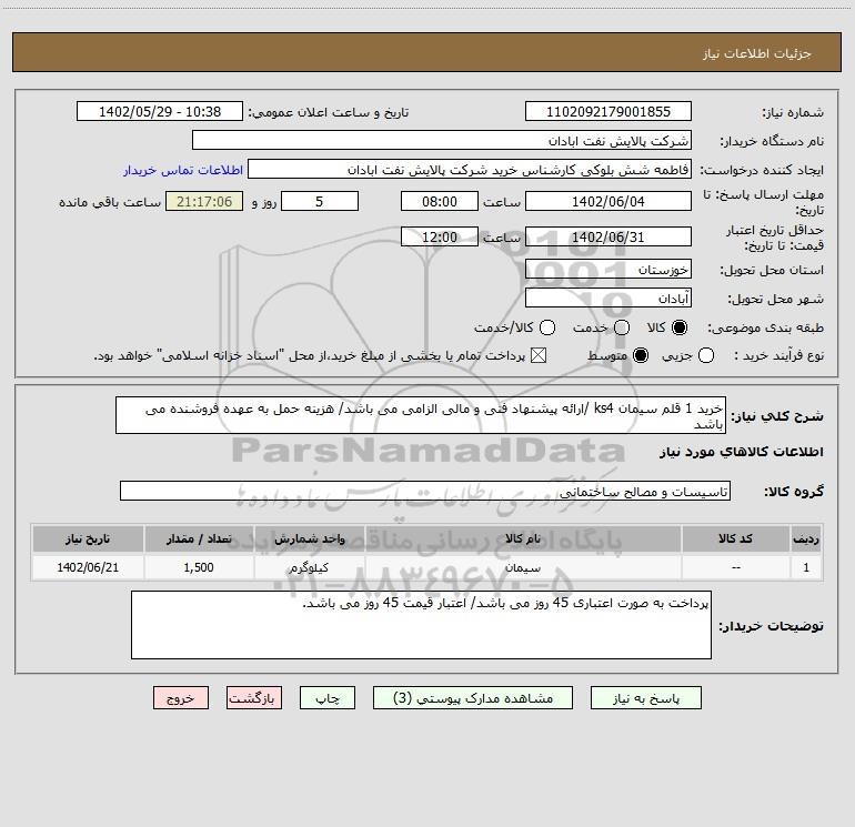 استعلام خرید 1 قلم سیمان ks4 /ارائه پیشنهاد فنی و مالی الزامی می باشد/ هزینه حمل به عهده فروشنده می باشد, استعلام خرید 1 قلم سیمان ks4 /ارائه پیشنهاد فنی و مالی الزامی می باشد/ هزینه حمل به عهده فروشنده می باشد