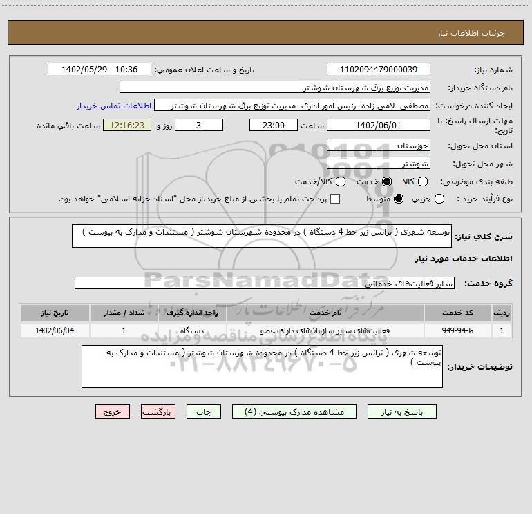 شرح کلی نیاز: توسعه شهری ( ترانس زیر خط 4 دستگاه ) در محدوده شهرستان شوشتر ( مستندات و مدارک به پیوست )