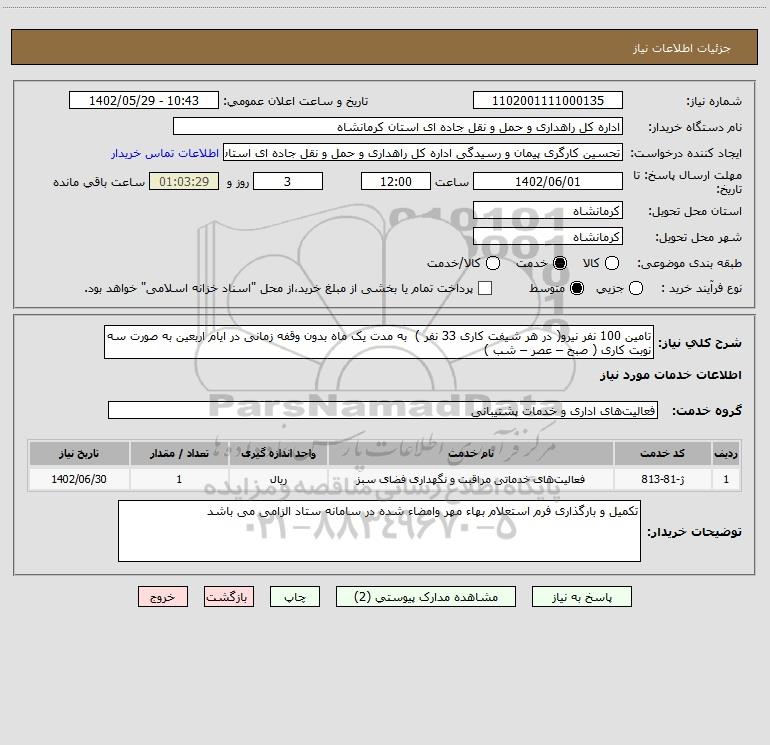 شرح کلی نیاز: تامین 100 نفر نیرو( در هر شیفت کاری 33 نفر ) به مدت یک ماه بدون وقفه زمانی در ایام اربعین به صورت سه نوبت کاری ( صبح – عصر – شب )