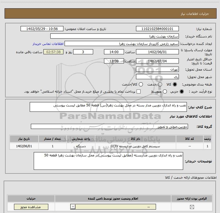 شرح کلی نیاز: نصب و راه اندازی دوربین مدار بسته در محل بهشت زهرا(س) قطعه 50 مطابق لیست پیوستی