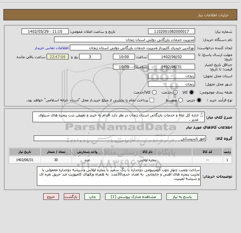 شرح کلی نیاز: اداره کل غله و خدمات بازرگانی استان زنجان در نظر دارد اقدام به خرید و تعویض درب پنجره های سیلوی غدیر .