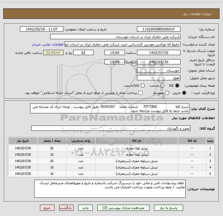 شرح کلی نیاز: شرح کالا FITTING شماره تقاضا 0034307 طبق فایل پیوست . توجه: ایران کد مشابه می باشد حتما به فایل پیوست مراجعه شود.