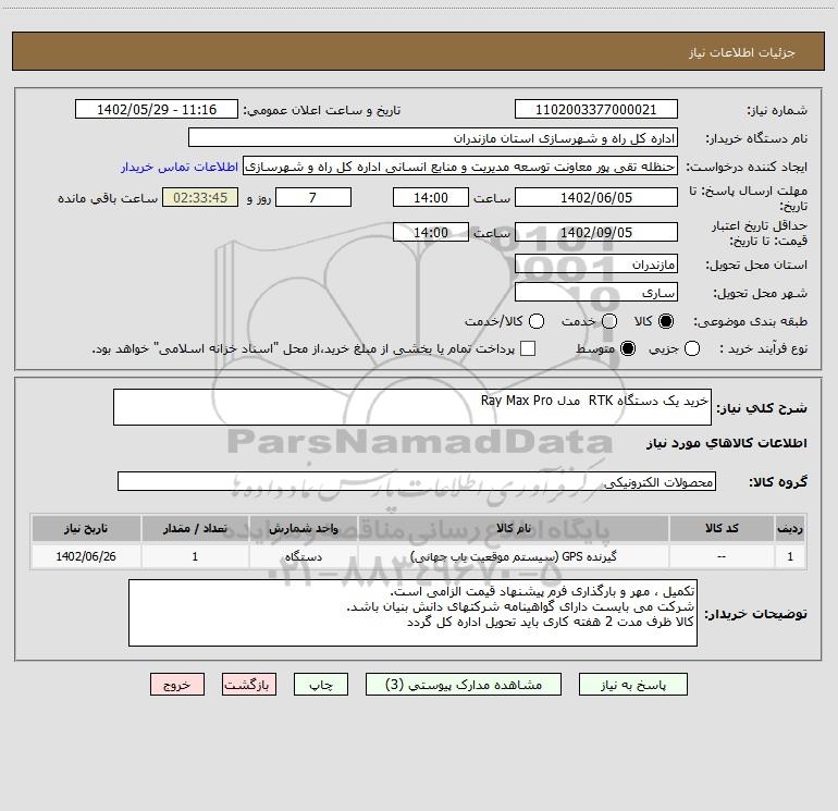 شرح کلی نیاز: خرید یک دستگاه RTK مدل Ray Max Pro