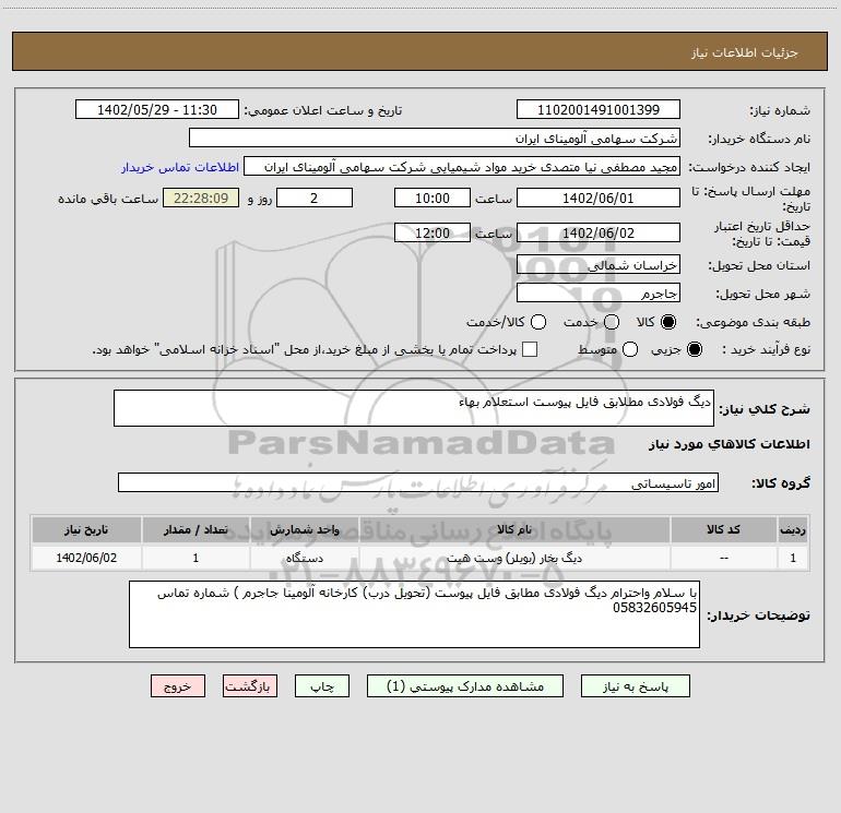 توضیحات خریدار:با سلام واحترام دیگ فولادی مطابق فایل پیوست (تحویل درب) کارخانه آلومینا جاجرم ) شماره تماس 05832605945