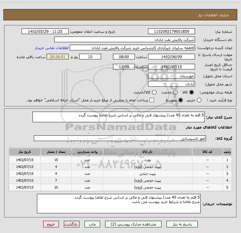 توضیحات خریدار:5 قلم به تعداد 40 عدد/ پیشنهاد فنی و مالی بر اساس شرح تقاضا پیوست گردد شرح تقاضا و شرایط خرید پیوست می باشد