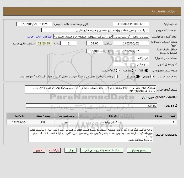 شرح کلی نیاز: شیلنگ های هیدرولیک 140 رشته از نوع برندهای اروپایی باشد (بشرح پیوست)اطلاعات فنی :آقای بنی اسدی 09133979954