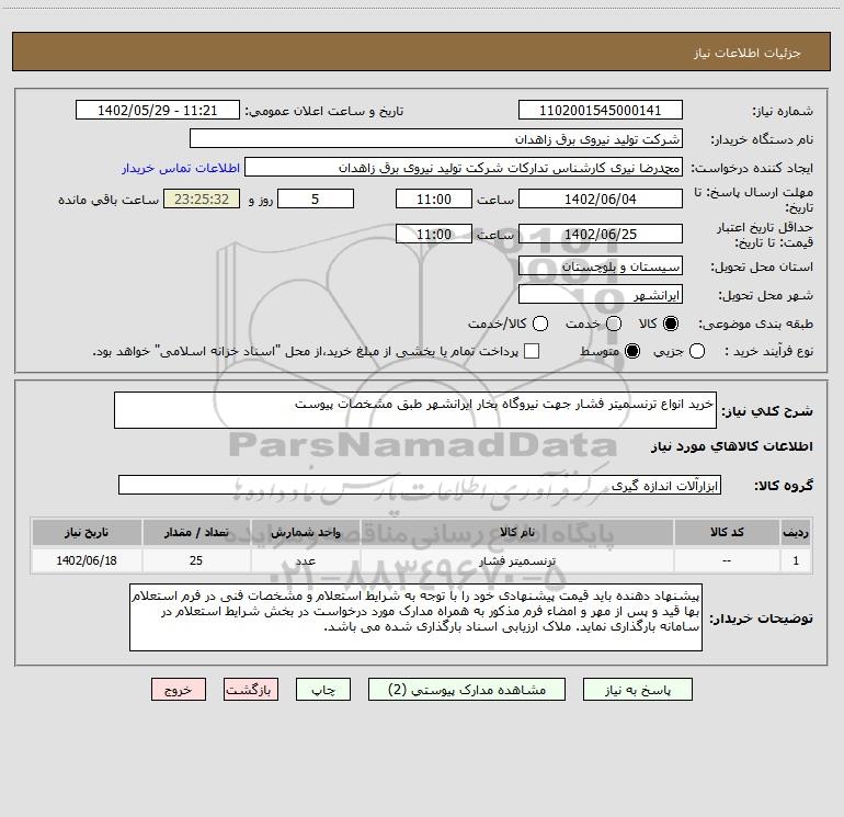 شرح کلی نیاز: خرید انواع ترنسمیتر فشار جهت نیروگاه بخار ایرانشهر طبق مشخصات پیوست