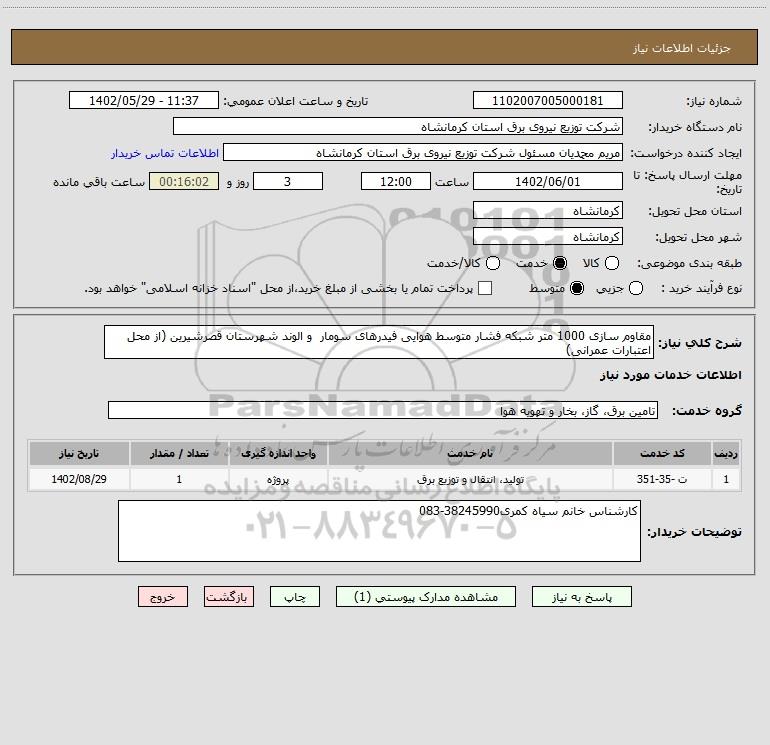 شرح کلی نیاز: مقاوم سازی 1000 متر شبکه فشار متوسط هوایی فیدرهای سومار و الوند شهرستان قصرشیرین (از محل اعتبارات عمرانی)