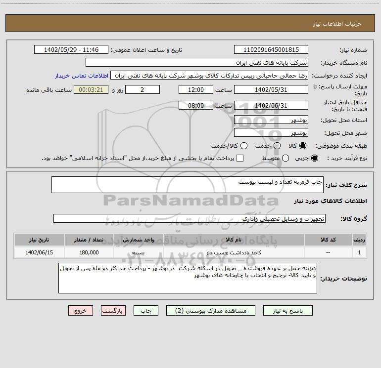 شرح کلی نیاز: چاپ فرم به تعداد و لیست پیوست
