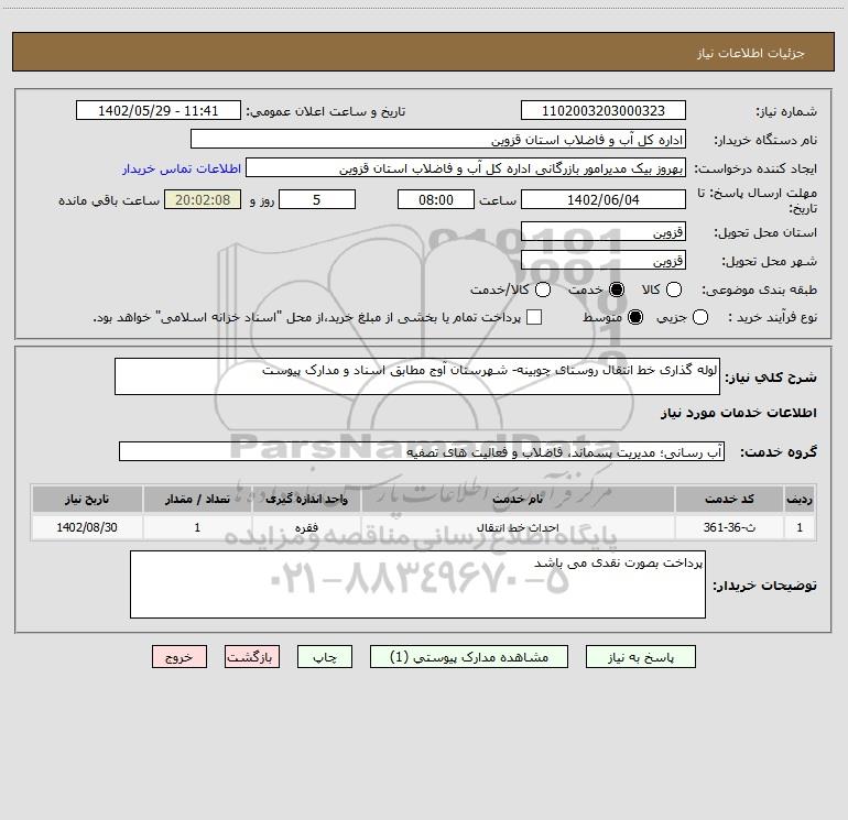 شرح کلی نیاز: لوله گذاری خط انتقال روستای چوبینه- شهرستان آوج مطابق اسناد و مدارک پیوست