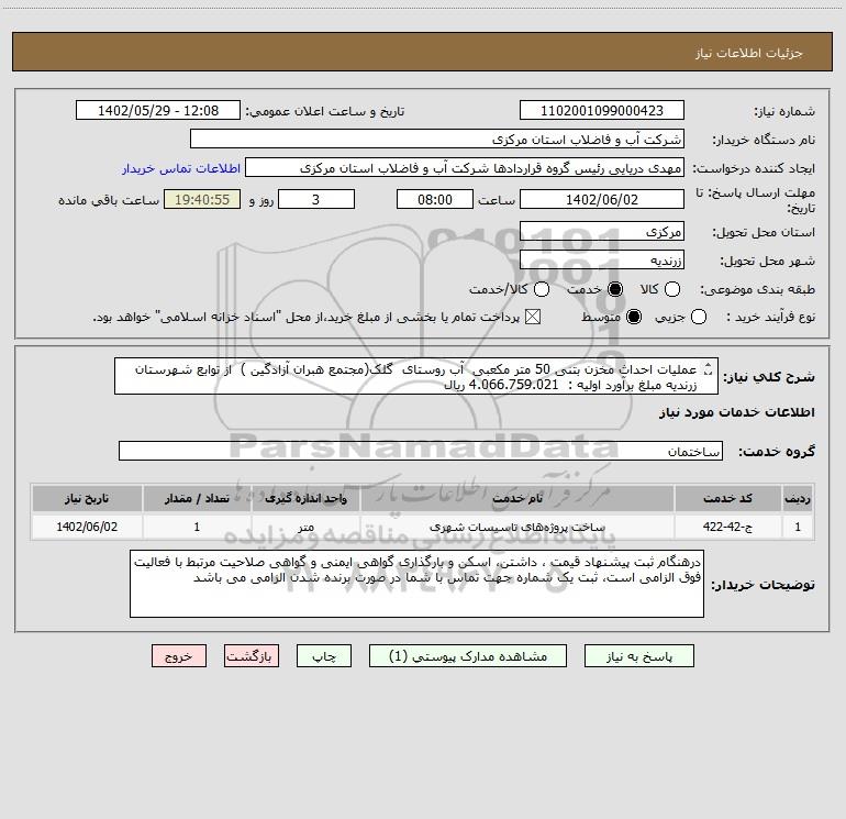 شرح کلی نیاز: عملیات احداث مخزن بتنی 50 متر مکعبی آب روستای گلک(مجتمع هبران آزادگین ) از توابع شهرستان زرندیه مبلغ برآورد اولیه : 4.066.759.021 ریال