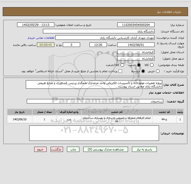 شرح کلی نیاز: پروژه تعمیرات موتورخانه و تأسیسات الکتریکی واحد مرغداری تخمگذار پردیس کشاورزی و منابع طبیعی دانشگاه رازی مطابق اسناد پیوست