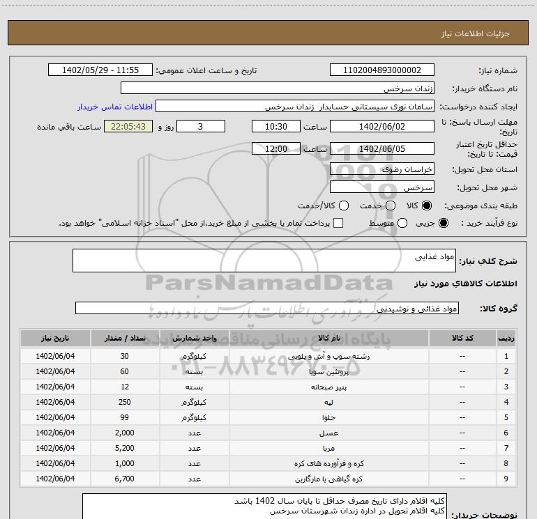 توضیحات خریدار:کلیه اقلام دارای تاریخ مصرف حداقل تا پایان سال 1402 باشد کلیه اقلام تحویل در اداره زندان شهرستان سرخس