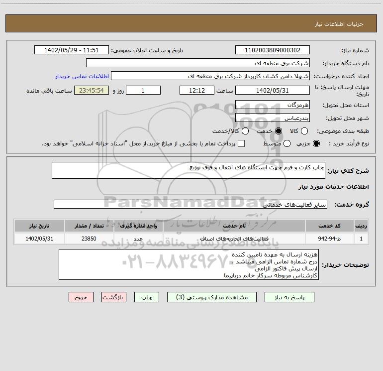 شرح کلی نیاز: چاپ کارت و فرم جهت ایستگاه های انتقال و فوف توزیع