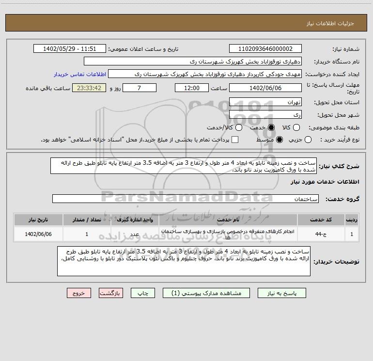 شرح کلی نیاز: ساخت و نصب زمینه تابلو به ابعاد 4 متر طول و ارتفاع 3 متر به اضافه 3.5 متر ارتفاع پایه تابلو طبق طرح ارائه شده با ورق کامپوزیت برند نانو باند،