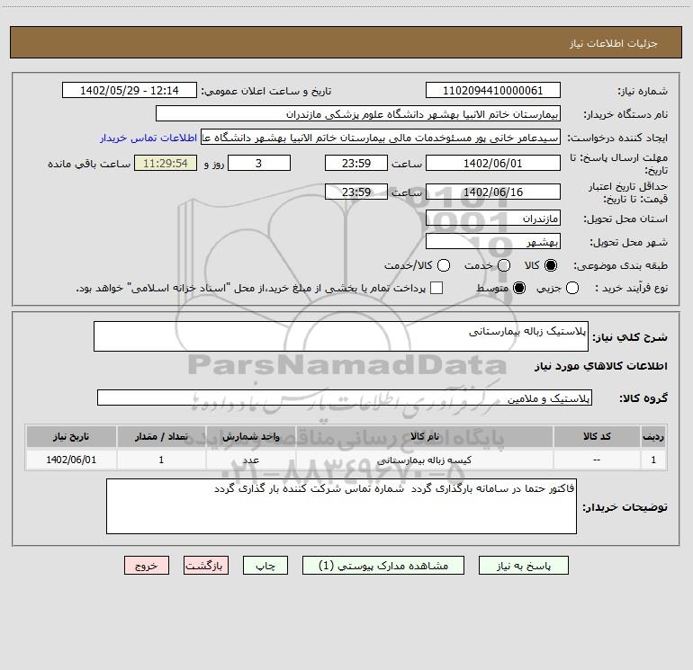 | 1 | -- | کیسه زباله بیمارستانی | عدد | 1 | 1402/06/01 |